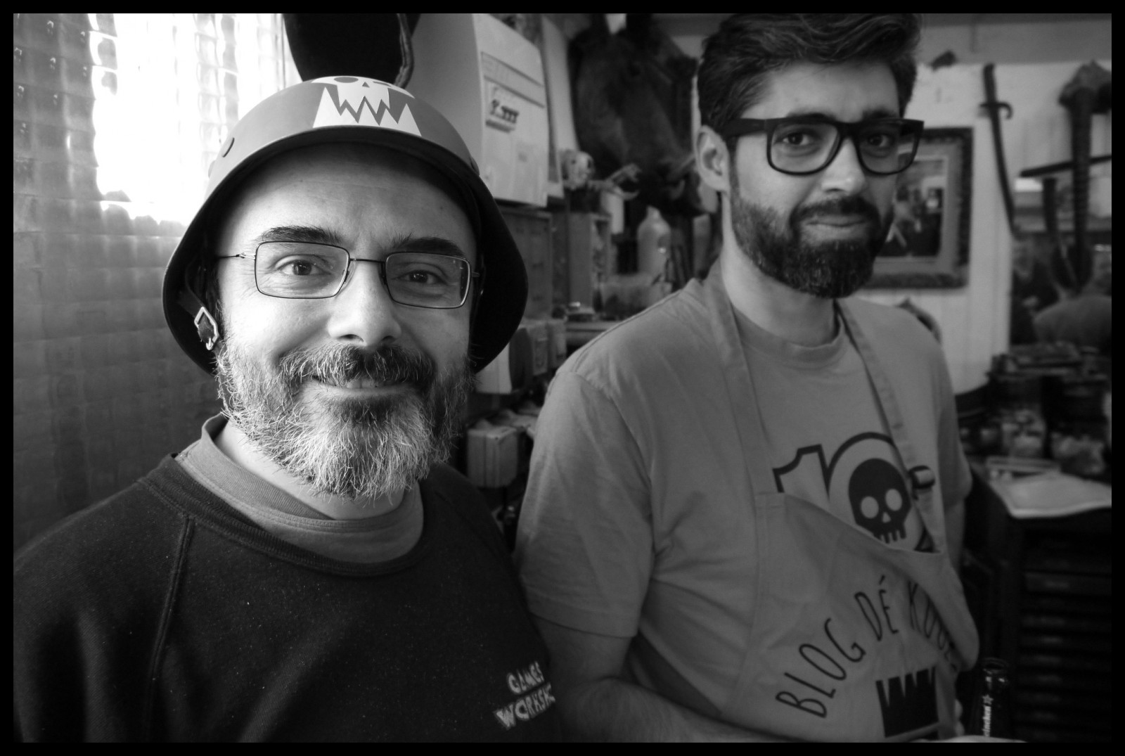 Deux barbouzes du zhobby. L'assassin a des lunettes, une barbe, un petit sourire malsain... et un casque.